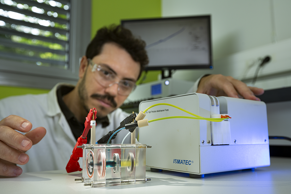 Dans le cadre du projet ANR NANOFUELCELL, une équipe du Département de chimie moléculaire (DCM – CNRS / UGA) vise à développer une pile enzymatique à flux sans métaux nobles, permettant de générer un courant électrique. Son fonctionnement repose sur des réactions d’oxydo-réduction, sources d'énergie chimique convertie en électricité.