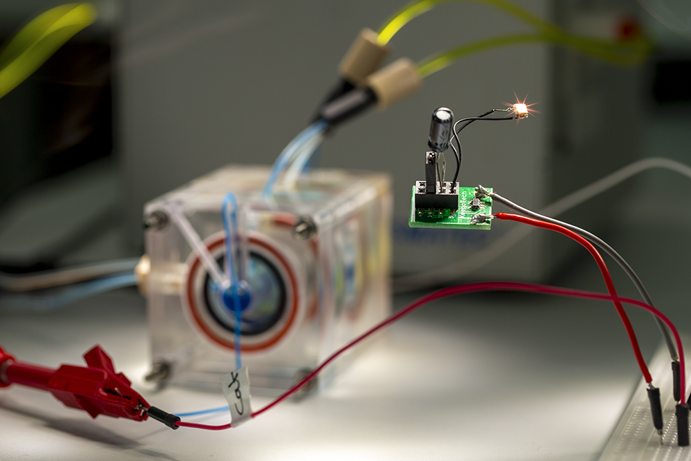 La pile est également reliée à une pompe à flux (péristaltique) afin d’apporter régulièrement un substrat nécessaire à son fonctionnement. Ce substrat est constitué de glucose côté anode, et de dioxygène côté cathode, tous deux nécessaires pour entretenir les réactions d’oxydo-réduction qui permettent à la pile de produire de l'électricité. Lorsque les électrodes de la pile sont connectées à un circuit électrique extérieur, comme ici, la conversion de l’énergie chimique en énergie électrique devient possible. L’énergie produite permet d'allumer une LED pendant un court instant.